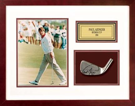 (Ryder Cup/Kiawah Island, SC) American Paul Azinger raises his fist in the air after sinking a put to win on the 12th hole, to win a match here September 28, 1991. Azinger and teammate Mark O'Meara defeated Nick Faldo and David Gilford. Authentically hand-signed club heads, in a shadow box, with photograph and custom brass plate, elegantly double-matted. This item comes in a burgundy frame.A Certificate of Authenticity is included with this autographed golf club head. Something About Pro Tour Memorabilia Authentication Process: Pro Tour Memorabilia pioneered the authentication of autographed golf memorabilia and its stringent authentication process ensures that you are receiving a genuine, limited edition collector's item. Their unique process begins with a witness who actually supervises the signing of each piece. The golf professional then signs an affidavit certifying the authenticity of the item, as well as the number of pieces actually signed. A tamper-resistant, serial-numbered hologram is affixed to the finished product. A Certificate of Authenticity is then issued which bears the identical number appearing on the hologram. In addition, each certificate features a description of the item and the moment in history it reflects. This process guarantees the piece you have purchased is completely authentic. Something About Pro Tour Memorabilia: Pro Tour Memorabilia has the LARGEST collection in the World of original, authentic autographed collectibles from the stars and legends of golf. Each professional works directly with Pro Tour Memorabilia to commission and develop products. Never before available exclusive golf mementos, historical photography and fine art lithographs, elegantly framed and impeccably presented.A Historic Investment - Each piece undergoes a stringent authentication process to ensure its value for generations to come. Pro Tour Memorabilia exclusively is the ONLY company holding exclusive agreements with its legendary golf professionals. Pro Tour Memorabilia is OFFICIALLY licensed by the PGA TOUR. In the event this photo is sold out, another photo of the same athlete will be sent.