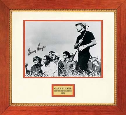 (Carnoustie, Scotland) South Africa's Gary Player seems to "one hand it " as he fires out of the rough on the second fairway during second round play in the British Open Golf Championship here July 11,1968. Player would go on to win his second of three British Open titles, shooting a 289. Dimensions: 18"Wx20"H. Hand-signed photo with engraved brass plate. This item comes in a burl (red) frame. A Certificate of Authenticity is included with this autographed photograph. Something About Pro Tour Memorabilia Authentication Process: Pro Tour Memorabilia pioneered the authentication of autographed golf memorabilia and its stringent authentication process ensures that you are receiving a genuine, limited edition collector's item. Their unique process begins with a witness who actually supervises the signing of each piece. The golf professional then signs an affidavit certifying the authenticity of the item, as well as the number of pieces actually signed. A tamper-resistant, serial-numbered hologram is affixed to the finished product. A Certificate of Authenticity is then issued which bears the identical number appearing on the hologram. In addition, each certificate features a description of the item and the moment in history it reflects. This process guarantees the piece you have purchased is completely authentic. Something About Pro Tour Memorabilia: Pro Tour Memorabilia has the LARGEST collection in the World of original, authentic autographed collectibles from the stars and legends of golf. Each professional works directly with Pro Tour Memorabilia to commission and develop products. Never before available exclusive golf mementos, historical photography and fine art lithographs, elegantly framed and impeccably presented.A Historic Investment - Each piece undergoes a stringent authentication process to ensure its value for generations to come. Pro Tour Memorabilia exclusively is the ONLY company holding exclusive agreements with its legendary golf professionals. Pro Tour Memorabilia is OFFICIALLY licensed by the PGA TOUR. In the event this photo is sold out, another photo of the same athlete will be sent.