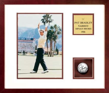 Pat Bradley at the Nabisco Dinah Shore 1986. In 1992, Pat Bradley became only the 12th golfer in 41 years to be inducted into the prestigious PGA Hall of Fame, one of the most difficult attainments in sports. She was the fourth player in LPGA history to reach the one million mark, but became the first player in LPGA history to surpass the $2, $3 and $4 million milestones in 1986, 1990 and 1991, respectively. Bradley's 30 wins include 6 major championships, she is the only golfer in LPGA history to win the Grand Slam. Her best year, 1989, included 5 tournament wins, 3 of which were major championships. Authentically hand-signed golf ball, in a shadow box, with photograph and custom brass plate, elegantly double-matted. This item comes in a burgundy frame. A Certificate of Authenticity is included with this autographed golf ball. Something About Pro Tour Memorabilia Authentication Process: Pro Tour Memorabilia pioneered the authentication of autographed golf memorabilia and its stringent authentication process ensures that you are receiving a genuine, limited edition collector's item. Their unique process begins with a witness who actually supervises the signing of each piece. The golf professional then signs an affidavit certifying the authenticity of the item, as well as the number of pieces actually signed. A tamper-resistant, serial-numbered hologram is affixed to the finished product. A Certificate of Authenticity is then issued which bears the identical number appearing on the hologram. In addition, each certificate features a description of the item and the moment in history it reflects. This process guarantees the piece you have purchased is completely authentic. Something About Pro Tour Memorabilia: Pro Tour Memorabilia has the LARGEST collection in the World of original, authentic autographed collectibles from the stars and legends of golf. Each professional works directly with Pro Tour Memorabilia to commission and develop products. Never before available exclusive golf mementos, historical photography and fine art lithographs, elegantly framed and impeccably presented.A Historic Investment - Each piece undergoes a stringent authentication process to ensure its value for generations to come. Pro Tour Memorabilia exclusively is the ONLY company holding exclusive agreements with its legendary golf professionals. Pro Tour Memorabilia is OFFICIALLY licensed by the PGA TOUR. In the event this photo is sold out, another photo of the same athlete will be sent.