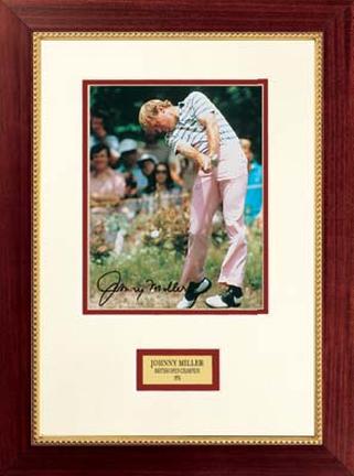 Johnny Miller-British Open 1976. Miller was the only player other than Jack Nicklaus and Tom Watson to win money title between 1971 and 1980. Dimensions: 16.5"Wx21"H. Hand-signed photo with engraved brass plate. This item comes in a burgundy frame. A Certificate of Authenticity is included with this autographed photograph. Something About Pro Tour Memorabilia Authentication Process: Pro Tour Memorabilia pioneered the authentication of autographed golf memorabilia and its stringent authentication process ensures that you are receiving a genuine, limited edition collector's item. Their unique process begins with a witness who actually supervises the signing of each piece. The golf professional then signs an affidavit certifying the authenticity of the item, as well as the number of pieces actually signed. A tamper-resistant, serial-numbered hologram is affixed to the finished product. A Certificate of Authenticity is then issued which bears the identical number appearing on the hologram. In addition, each certificate features a description of the item and the moment in history it reflects. This process guarantees the piece you have purchased is completely authentic. Something About Pro Tour Memorabilia: Pro Tour Memorabilia has the LARGEST collection in the World of original, authentic autographed collectibles from the stars and legends of golf. Each professional works directly with Pro Tour Memorabilia to commission and develop products. Never before available exclusive golf mementos, historical photography and fine art lithographs, elegantly framed and impeccably presented.A Historic Investment - Each piece undergoes a stringent authentication process to ensure its value for generations to come. Pro Tour Memorabilia exclusively is the ONLY company holding exclusive agreements with its legendary golf professionals. Pro Tour Memorabilia is OFFICIALLY licensed by the PGA TOUR. In the event this photo is sold out, another photo of the same athlete will be sent.