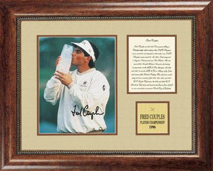 Fred Couples seals his victory with a kiss in the 1996 Players Championship, March 31, 1996. Among his many achievements, Couples won the 1984 Tournament Players Championship, while carding a then course record 64 at the TPC Saw grass, and repeated in 1992 with a new TPC course record at 63. Couples won the 1992 Arnold Palmer award as the leading money winner on the PGA Tour. He is feared in match play and was a member of the 1989, 1991, 1993, and 1995 U.S. Ryder Cup teams, the 1994 and 1996 U.S. Presidents Cup teams and teamed with Davis Love III to win a record four consecutive World Cup Golf Titles. Dimensions: 20"Wx18"H. Authentically hand-signed photograph, museum quality double bevel-cut mat, and wood frame. Complete with player biography and engraved brass plate.A Certificate of Authenticity is included with this autographed photograph. Something About Pro Tour Memorabilia Authentication Process: Pro Tour Memorabilia pioneered the authentication of autographed golf memorabilia and its stringent authentication process ensures that you are receiving a genuine, limited edition collector's item. Their unique process begins with a witness who actually supervises the signing of each piece. The golf professional then signs an affidavit certifying the authenticity of the item, as well as the number of pieces actually signed. A tamper-resistant, serial-numbered hologram is affixed to the finished product. A Certificate of Authenticity is then issued which bears the identical number appearing on the hologram. In addition, each certificate features a description of the item and the moment in history it reflects. This process guarantees the piece you have purchased is completely authentic. Something About Pro Tour Memorabilia: Pro Tour Memorabilia has the LARGEST collection in the World of original, authentic autographed collectibles from the stars and legends of golf. Each professional works directly with Pro Tour Memorabilia to commission and develop products. Never before available exclusive golf mementos, historical photography and fine art lithographs, elegantly framed and impeccably presented.A Historic Investment - Each piece undergoes a stringent authentication process to ensure its value for generations to come. Pro Tour Memorabilia exclusively is the ONLY company holding exclusive agreements with its legendary golf professionals. Pro Tour Memorabilia is OFFICIALLY licensed by the PGA TOUR. In the event this photo is sold out, another photo of the same athlete
