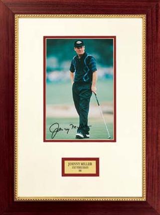 Johnny Miller poses during the 1995 AT & T Pebble Beach Tournament. Dimensions: 16.5"Wx21"H. Hand-signed photo with engraved brass plate. This item comes in a burgundy frame. A Certificate of Authenticity is included with this autographed photograph. Something About Pro Tour Memorabilia Authentication Process: Pro Tour Memorabilia pioneered the authentication of autographed golf memorabilia and its stringent authentication process ensures that you are receiving a genuine, limited edition collector's item. Their unique process begins with a witness who actually supervises the signing of each piece. The golf professional then signs an affidavit certifying the authenticity of the item, as well as the number of pieces actually signed. A tamper-resistant, serial-numbered hologram is affixed to the finished product. A Certificate of Authenticity is then issued which bears the identical number appearing on the hologram. In addition, each certificate features a description of the item and the moment in history it reflects. This process guarantees the piece you have purchased is completely authentic. Something About Pro Tour Memorabilia: Pro Tour Memorabilia has the LARGEST collection in the World of original, authentic autographed collectibles from the stars and legends of golf. Each professional works directly with Pro Tour Memorabilia to commission and develop products. Never before available exclusive golf mementos, historical photography and fine art lithographs, elegantly framed and impeccably presented.A Historic Investment - Each piece undergoes a stringent authentication process to ensure its value for generations to come. Pro Tour Memorabilia exclusively is the ONLY company holding exclusive agreements with its legendary golf professionals. Pro Tour Memorabilia is OFFICIALLY licensed by the PGA TOUR. In the event this photo is sold out, another photo of the same athlete will be sent.